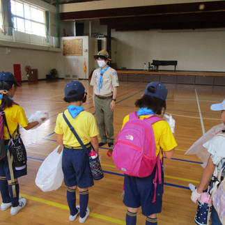 2023/9/10 スカウトの日スカウトの日の活動として、ゴミ拾いを行いました。 体育館内でセレモニー、続いて今月の歌、ロープの練習を行いました。ゲームでコースを決めた後、組ごとにゴミ拾いに出発しました。みんなで協力しながらゴミ拾いを行いました。帰ってから、感想文を書き、代表スカウトが発表しました。終わりのセレモニーです。優秀組が表彰されました。